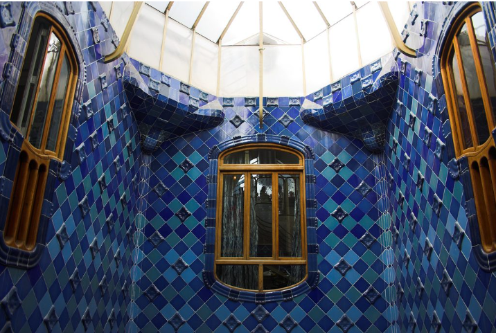 Una delle caratteristiche più sorprendenti di Casa Batlló è il suo gioco con la luce. Gaudí progettò l’edificio per massimizzare la luce naturale, creando un gioco dinamico di ombre e riflessi. Il cortile centrale, piastrellato in diverse tonalità di blu, cattura e diffonde la luce in tutto l’edificio, migliorando il senso di spazio e fluidità. Le finestre, con le loro vetrate colorate, proiettano un caleidoscopio di tonalità, creando un arazzo di luce e colore in continua evoluzione.
