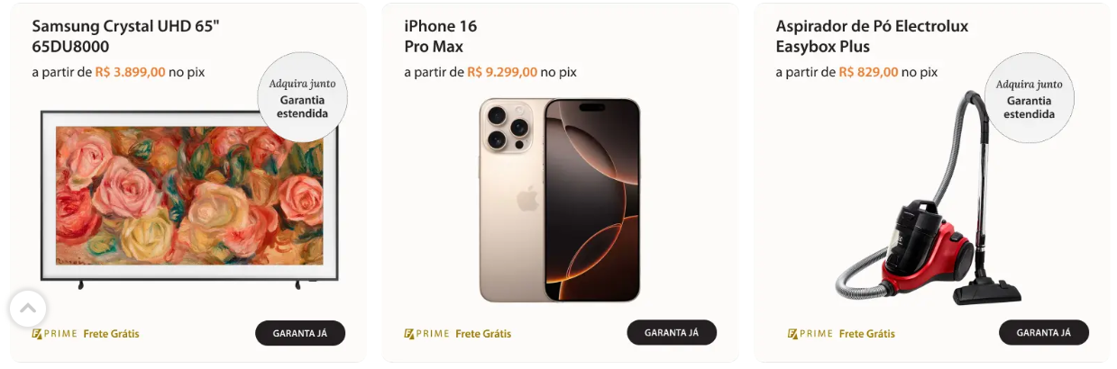 O programa Fast Shop Pay permite parcelamentos estendidos (em até 36 vezes, dependendo da categoria) e oferece cashback em compras selecionadas. Você também pode contratar seguros e garantias estendidas diretamente na plataforma.