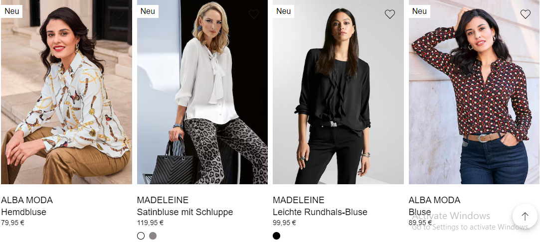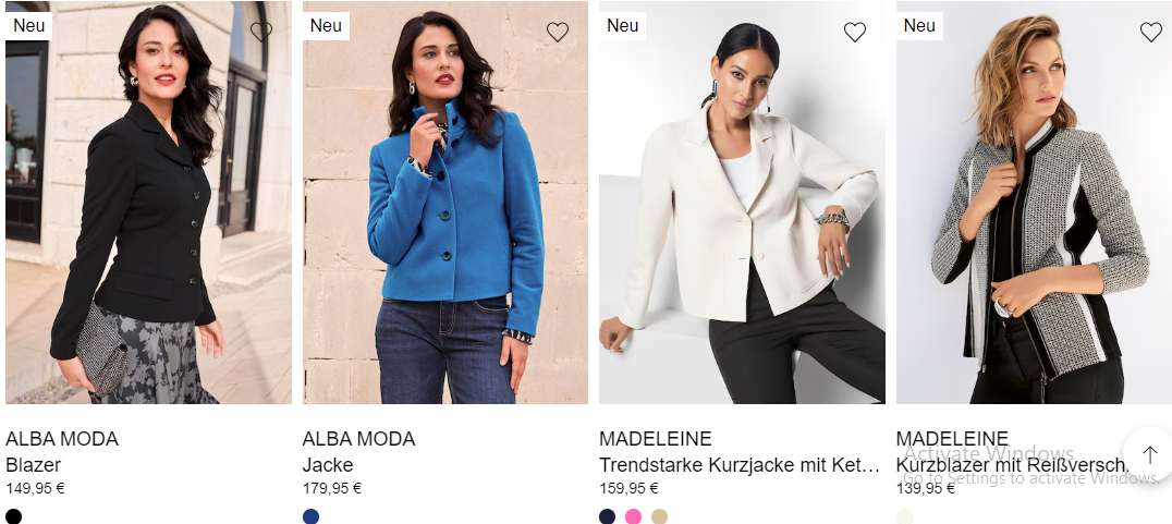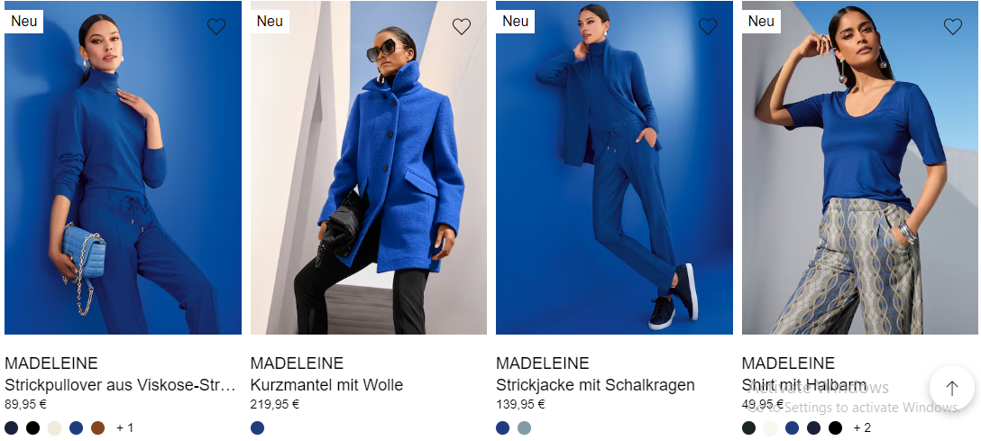 MADELEINE bietet eine vielfältige Auswahl an Stilen für verschiedene Geschmäcker und Anlässe. Ob Sie einen eleganten Business-Look, ein schickes Freizeit-Outfit oder etwas Elegantes für einen besonderen Anlass suchen, MADELEINE hat das Richtige für Sie. Die Kollektionen der Marke umfassen alles von maßgeschneiderten Anzügen und Blazern bis hin zu luxuriösen Abendkleidern, stilvoller Freizeitkleidung und raffinierten Accessoires.