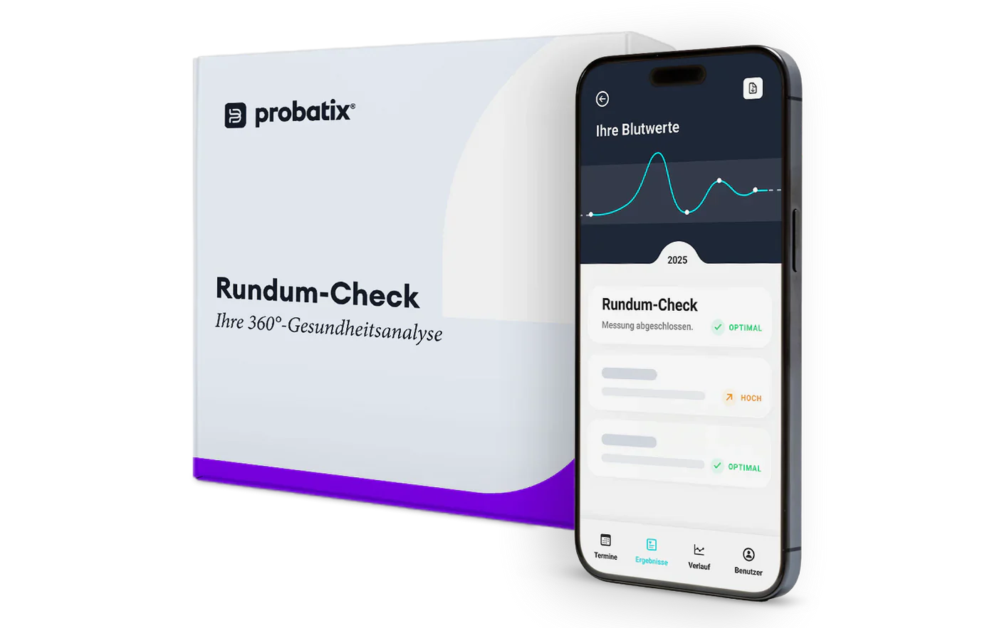 Die 360°-Checks von Probatix bieten eine umfassende Übersicht über verschiedene gesundheitliche Aspekte. Beispielsweise enthält der Große Gesundheits-Check Marker zu Leber, Niere, Blutzucker, Schilddrüse und Nährstoffen. Ideal für alle, die sich ein ganzheitliches Bild ihrer Gesundheit machen wollen.