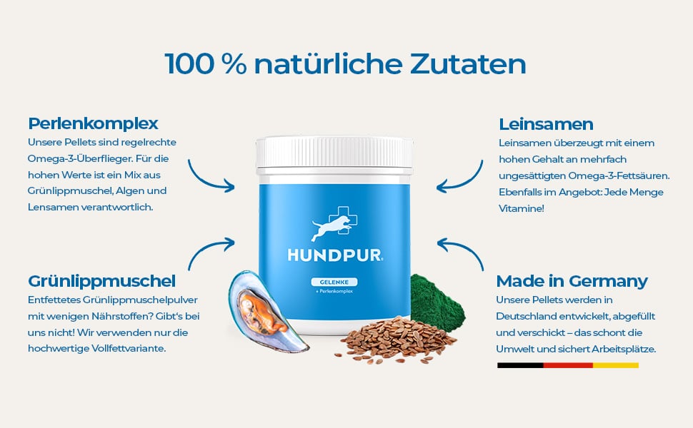 HundPur spezialisiert sich auf die Herstellung von natürlichen Supplements, die die Gelenkgesundheit deines Hundes unterstützen, ohne dass aggressive Chemikalien oder künstliche Zusätze notwendig sind. Die Gelenksupplements von HundPur werden mit hochwertigen, sorgfältig ausgewählten Inhaltsstoffen formuliert, die synergistisch wirken, um die Gelenkflexibilität zu fördern, Entzündungen zu reduzieren und die allgemeine Mobilität zu verbessern.